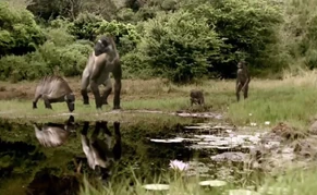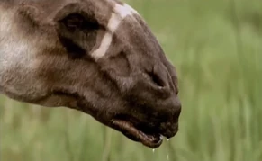 Ancylotherium first appeared in Walking with Beasts, later being featured as Stock footage in Walking with Cavemen. It is a re-texture of the Chalicotherium from an earlier episode with slight edits made to the model, most notably the hands which seem to be simply hooved hands rather than the clawed ones of the Chalicotherium. The Ancylotherium is golden in coloration, with a white counter-shaded underside. The lower arm and leg are black in color however the hands and feet seem to revert back to a lighter color. The face has a black mask on it, however the cheeks are white and it has large white stripes running along on its back.