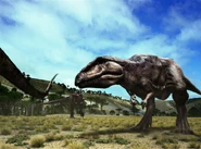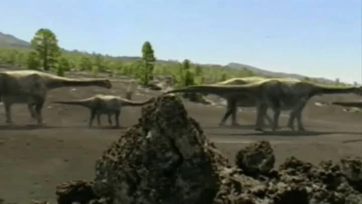 Role In the Planet Dinosaur episode New Giants, a baby Argentinosaurus hatches from its egg and a Lacusovagus almost immediately eats it. A Skorpiovenator appears, scaring away the Lacusovagus and gulping down the Argentinosaurus hatchling. As the abelisaurid gulps down more Argentinosaurus hatchlings, it lifts up its head and sees an adult Argentinosaurus towering over it, and it flees in fear. While the Argentinosaurus feed on the surrounding vegetation, a few individuals lay eggs in their nests. They are soon watched by a single Mapusaurus. Later, a herd of Argentinosaurus travel to find trees to browse on, and as they do so, they inadvertently create quicksand by churning up the ground with each step, and some Gasparinisaura fall into the quicksand and get sucked into it. The Argentinosaurus get on with feeding, with some rearing onto their hind legs to reach the higher vegetation in the trees while John Hurt talks about their adaptations to eat high vegetation. They then stop feeding when a pack of Mapusaurus attacks them. Although some sauropods do rear up in defense, the Mapusaurus find a weak sauropod in the herd and snack on it. The Argentinosaurus isn’t fatally wounded, however. During the attack, one Argentinosaurus gets agitated and flattens one of the Mapusaurus with its front feet. Near the end of the Planet Dinosaur episode New Giants, hordes of Skorpiovenator, Mapusaurus and Lacusovagus feed off the Argentinosaurus wounded by the Mapusaurus and a time lapse is shown of them feeding on the Argentinosaurus until it is nothing more than a skeleton. The episode soon ends with the Argentinosaurus skeleton becoming a fossil.