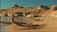 Although the pedipalps have the correct amount of segments, they are all very disproportionate when compared to the palps of modern scorpions and do not articulate properly. Furthermore, in several shots, the claws articulate in the wrong way, even though this is not the case in most instances. The walking appendages also seem to differ from their modern day counterparts. While the big compound eyes found in many primitive scorpions are preset, the median ocelli are not.
