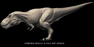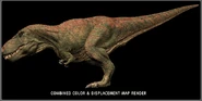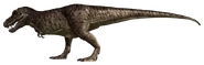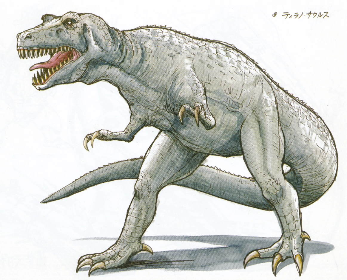 Featured prominantly in all media (arcade game, anime, DS game, TCG), the primary Tyrannosaurus model was an intense dark red with a pair of yellow stripes down its neck and back, being the poster example of the Fire Attribute comprising of large theropods. Later on, it received several altered forms which were recolors with different stats and backstories: the larger black and orange Black Tyrannosaurus, the flame-like orange crystal armor of Dinotector Tyrannosaurus, the white and gold Gigas (named for "Manospondylus gigas", an old Tyrannosaurus synonym) with purple-plated Spectral Armor bearing large pink crystal spikes, and the red, orange, and gray Super Tyrannosaurus.